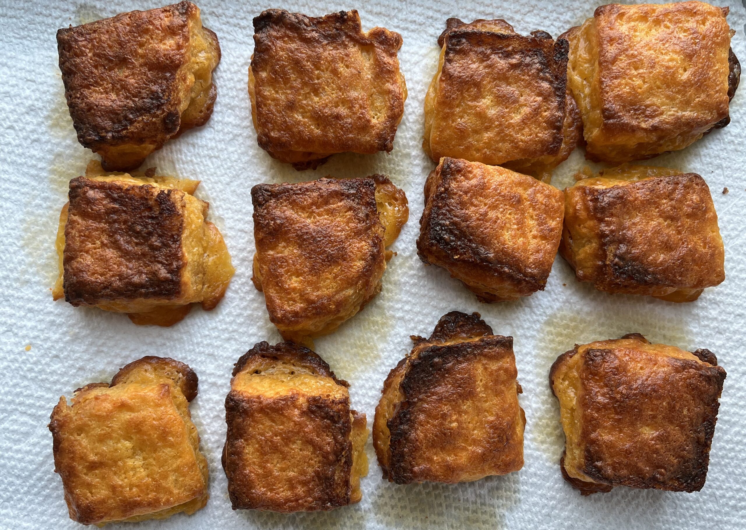 Place the bread squares on the prepared baking sheet, about an inch apart.  Bake for about 15 minutes until golden brown.  Transfer to a paper towel lined plate or platter to soak up grease from the bottom layer.  Serve immediately.