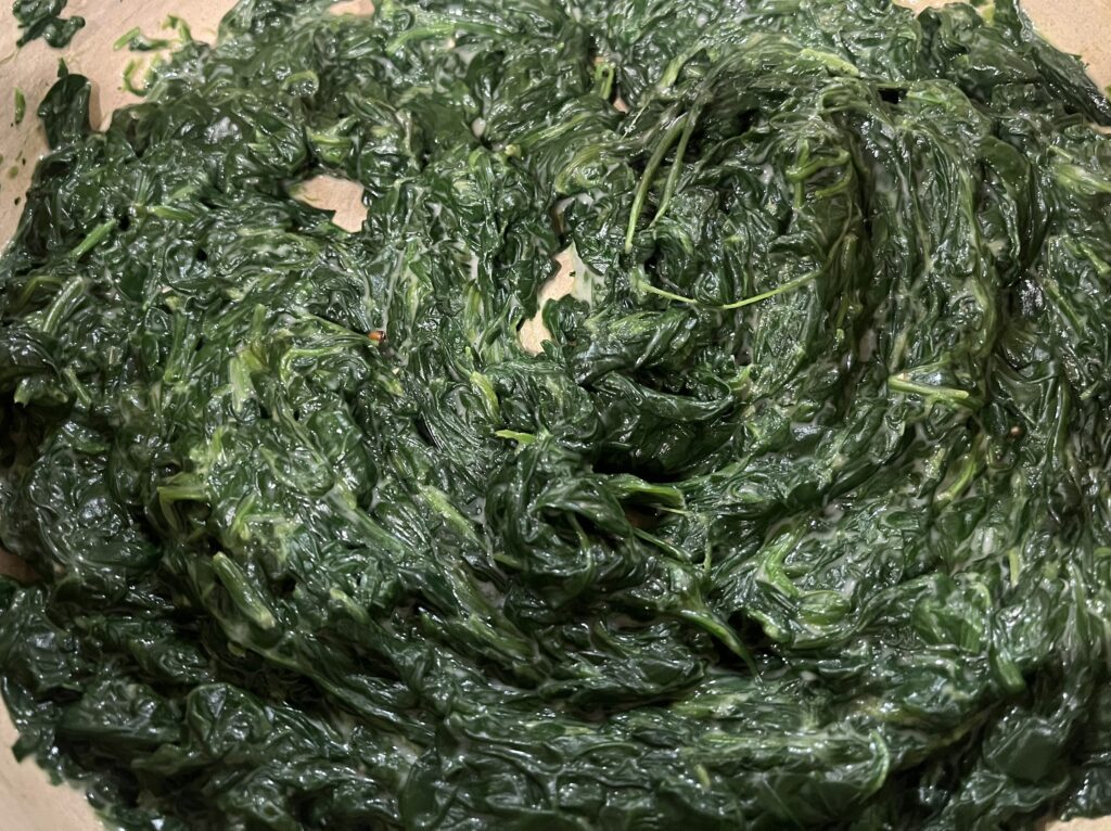 Put the spinach in a large pan over medium heat. Cover and cook about 5 minutes until thoroughly wilted. Drain the cooked spinach and chop it with a knife.