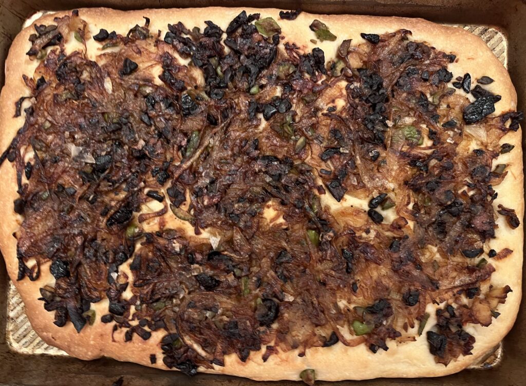 This onion, olive, and anchovy topped focaccia is essentially an Italian version of the Provencal dish Pissaladiere. This version is adapted from Nick Malgieri’s book, The Modern Baker. I made half of his recipe, which I baked in a quarter sheet pan (13 x 9). It made 3 servings for us for dinner with a salad. This can be made straight though in about 3.5 hours although I prepared the dough on one day and let it ferment slowly overnight in the refrigerator.