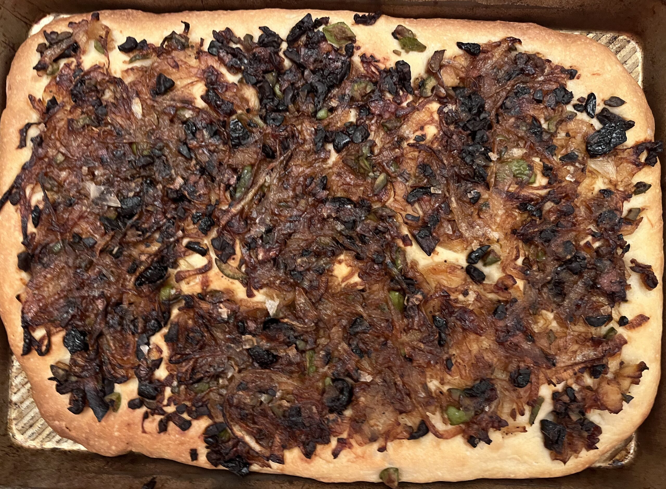 While the dough is rising, make the topping. Put 2 Tbs. of oil in a large skillet and add the onions. Heat until the onions have started to sizzle and then turn down the heat to cook the onions slowly until they have caramelized, about 20-30 minutes. Fold in the chopped anchovies and halved olives, and some freshly ground black pepper. Set aside to cool. (Can make this in advance.)