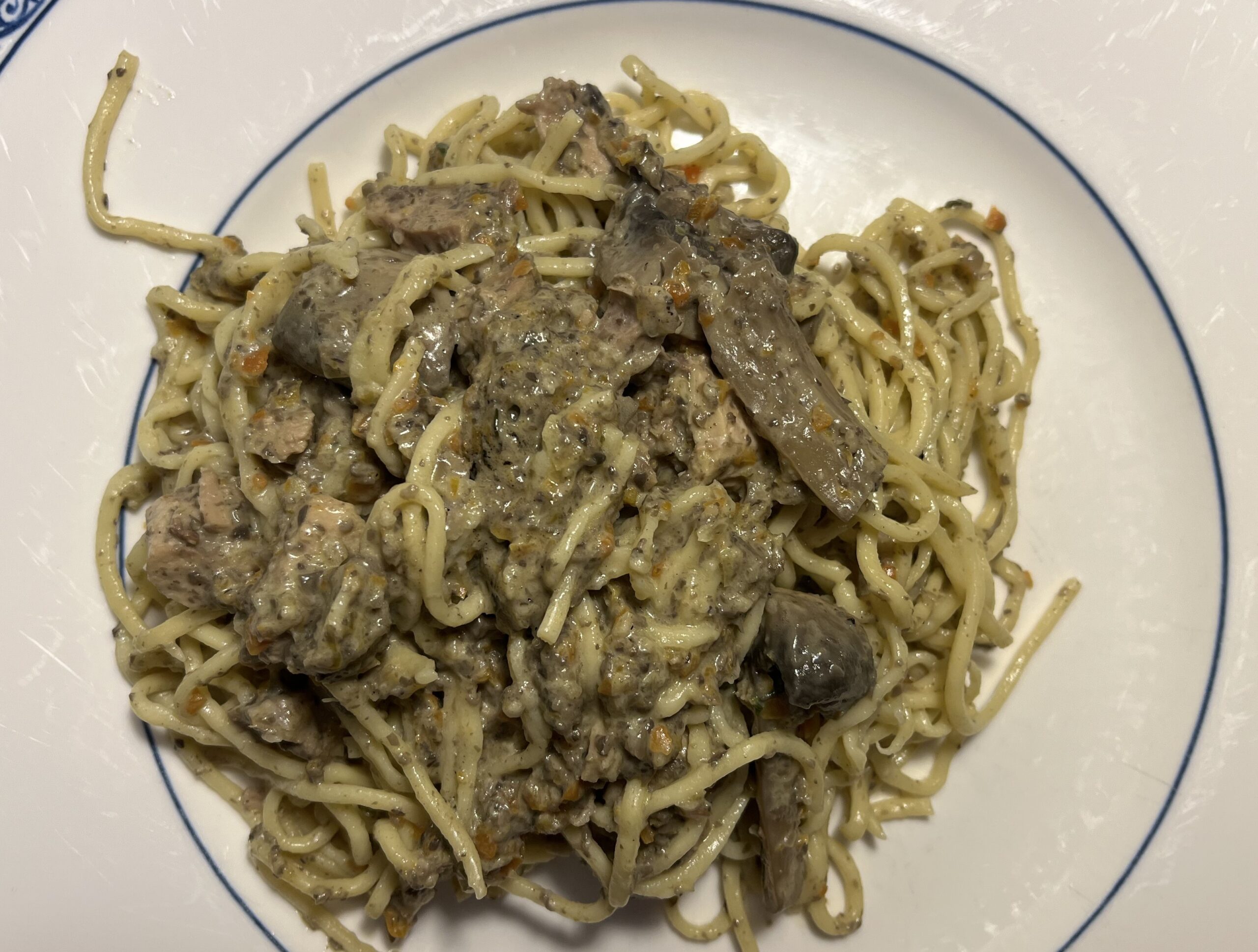 This was a successful experiment to substitute 25% of the durum semolina with high fiber flour. The result seemed no different from 100% durum semolina fresh pasta although I may have needed to add a little more water to the dough because high fiber flour is thirsty. I served it with Mushroom and Turkey Sugo