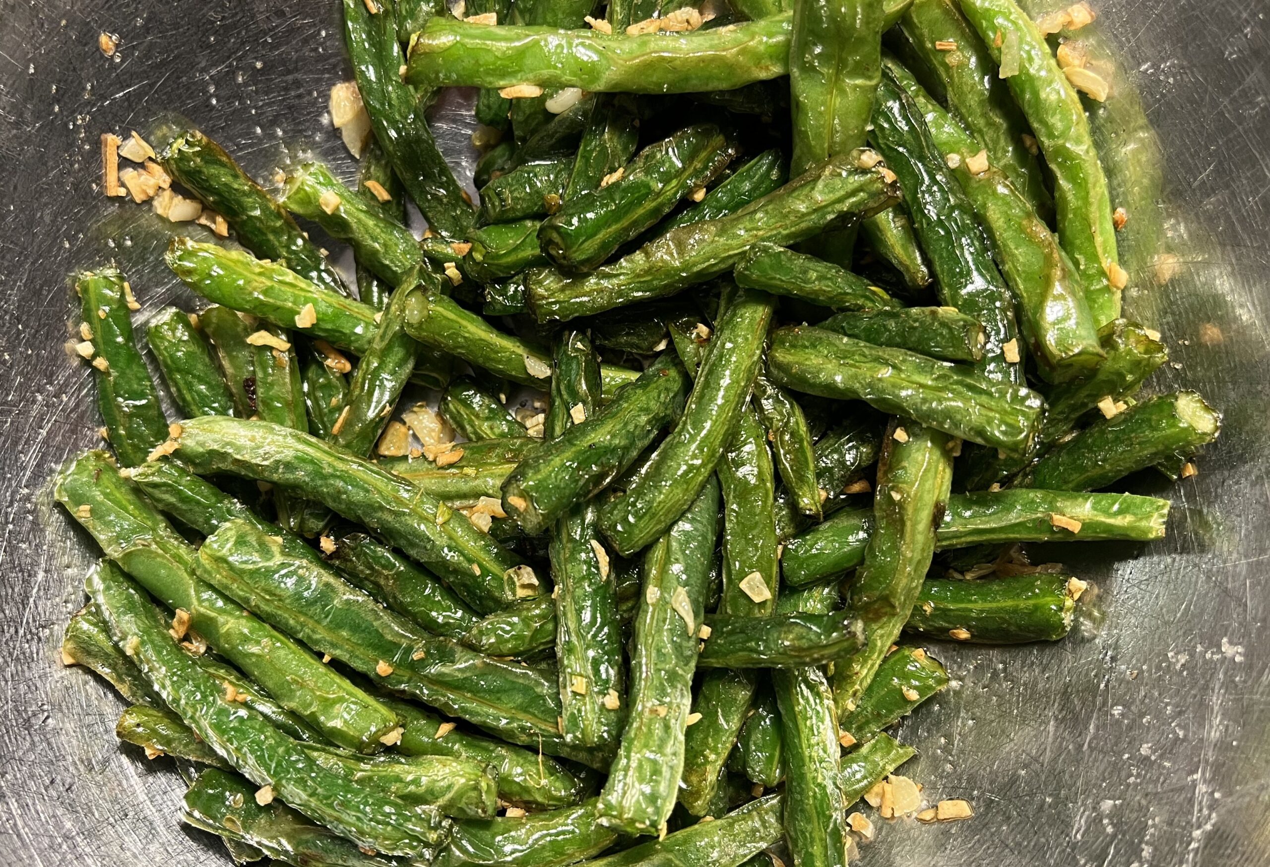 Add half of the green beans and fry for 1-2 minutes until the skin wrinkles. Remove the cooked green beans with a slotted spoon to a large bowl lined with paper towels. Repeat with the other half of the green beans.
