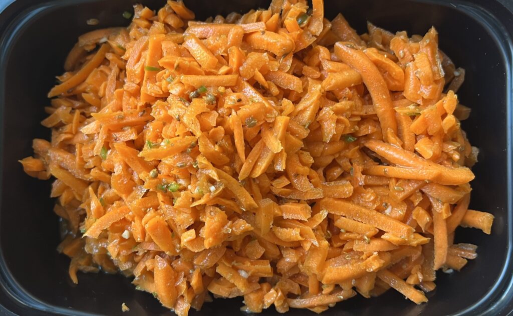 This will take about 1.5 hours to make, most of which is softening the carrots with salt before mixing in the spices, oil, and vinegar.  It will serve 4 persons.  It is best to let it rest for a few hours in the refrigerator before serving, which will lightly pickle the carrots.