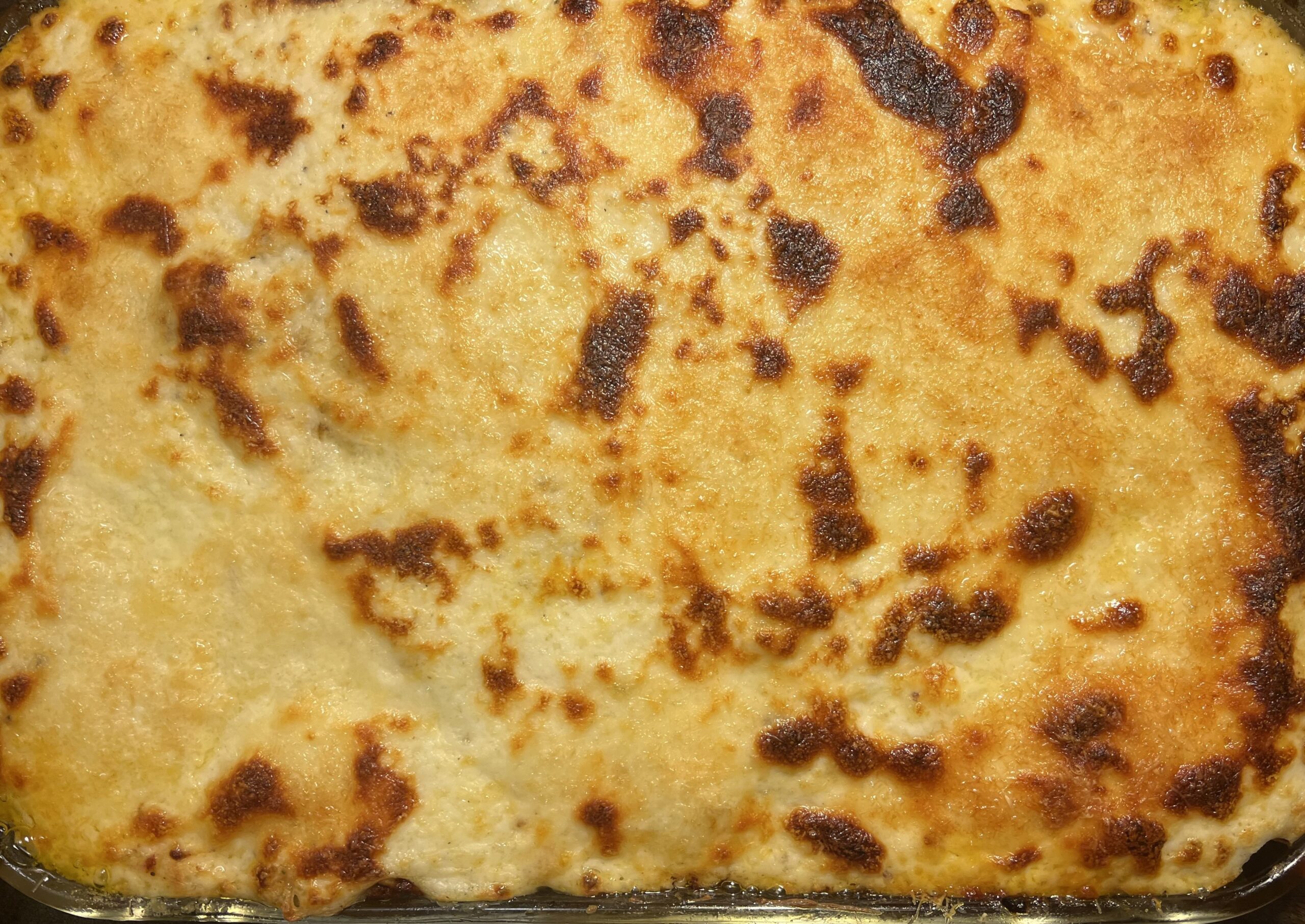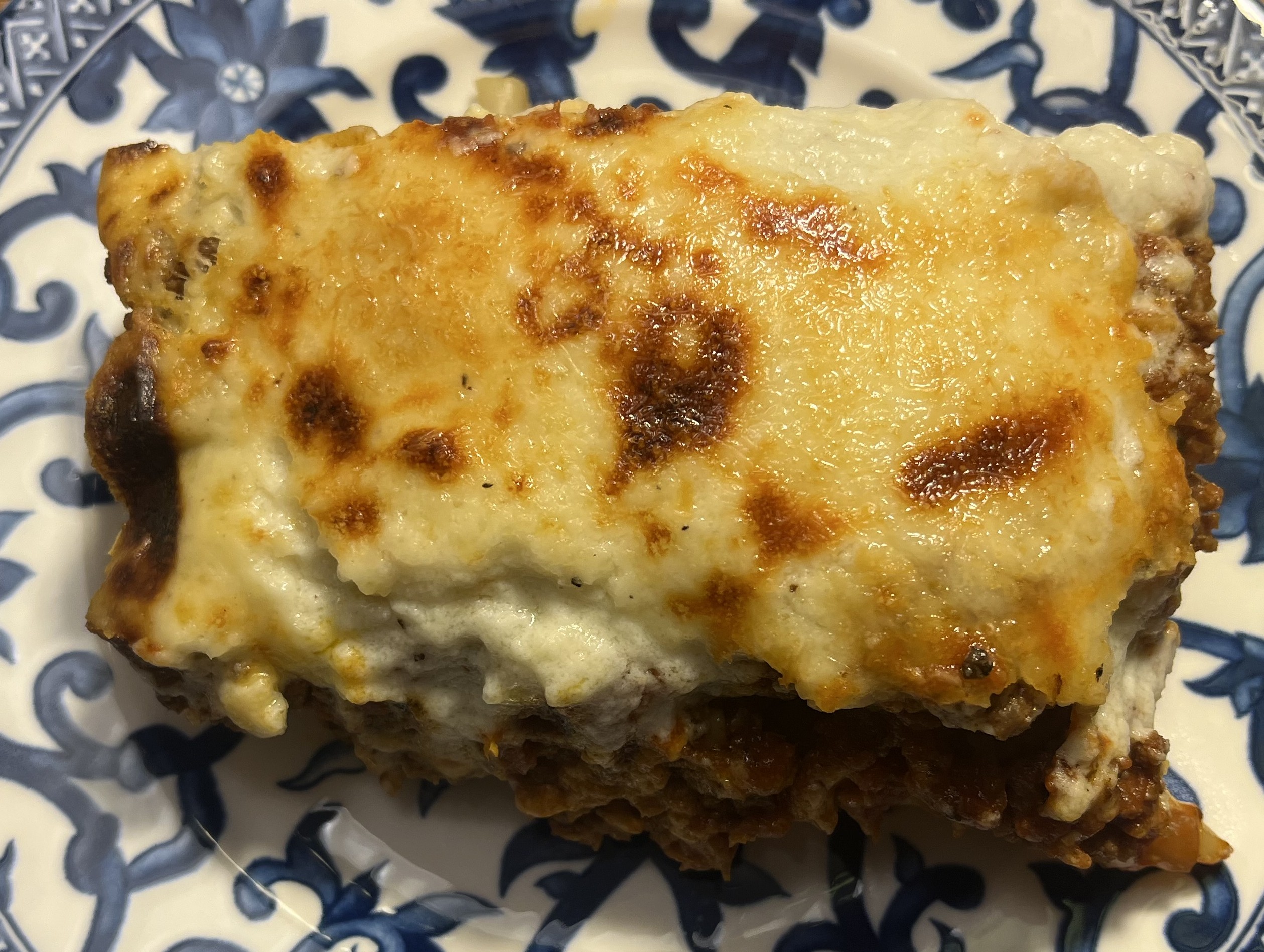 Put the coated pasta in the baking pan. Then add the meat sauce in an even layer, then the béchamel and last the Parmesan. The pan will be very full. Put in the oven uncovered and bake for 30-40 minutes until it is heated through, bubbly and the top is golden brown. If it could use more browning, turn on the broiler and broil it for a couple of minutes.