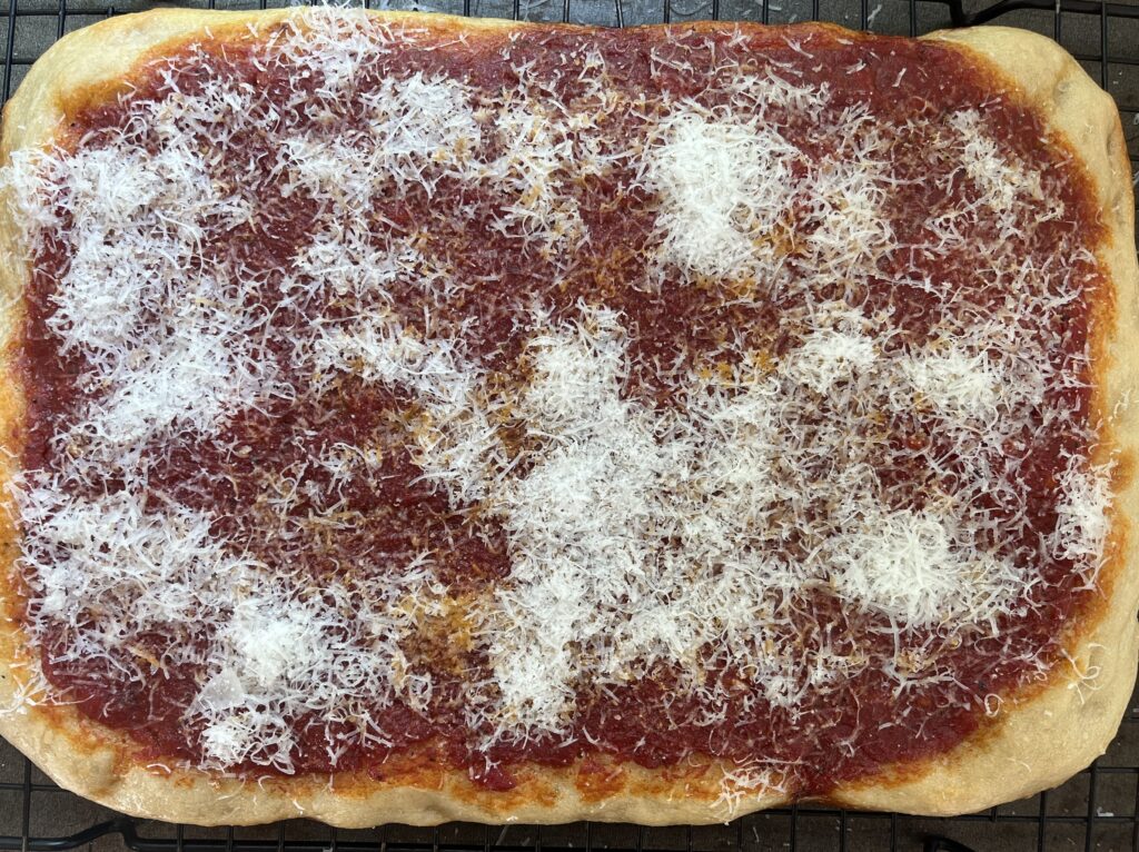 This cousin to pizza originated with Italian-American bakeries in Philadelphia. Unlike pizza this is generally served at room temperature (like other bakery items) and has little or no topping other than a thick layer of tomato sauce, and it is baked at a lower temperature. This version was topped with a light layer of Pecorino Romano and is adapted from a recipe at www.2foodtrippers.com. It will make 4 lunch servings or 8 or 16 pieces as a snack at a party.