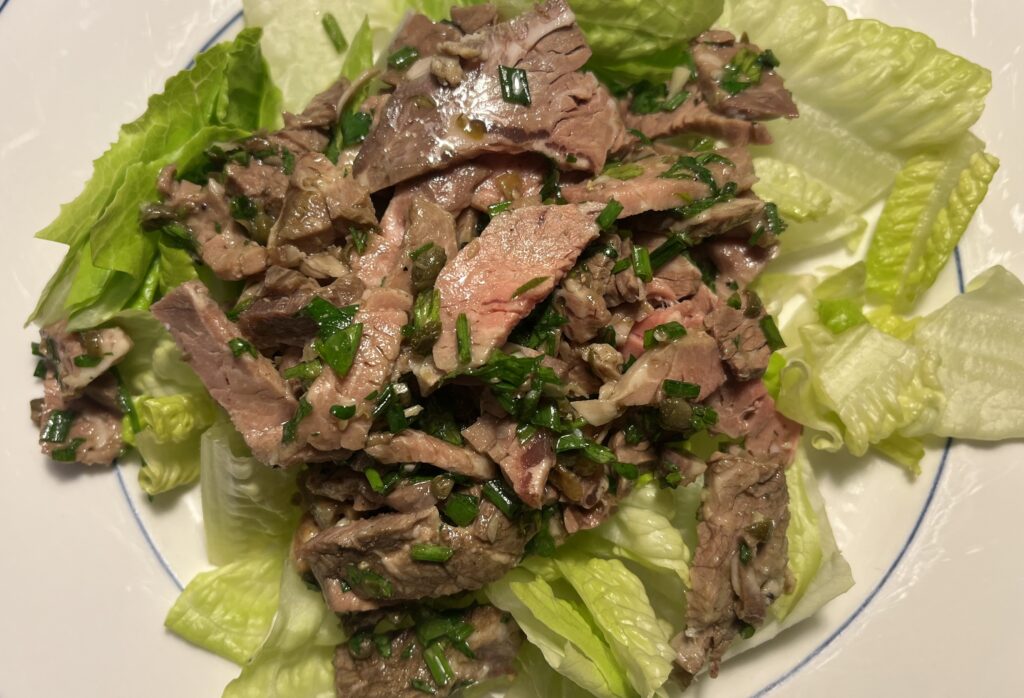 Ben gave me the Alison Roman cookbook Something from Nothing for Christmas, and I spotted a recipe “Steak Like Tartare” which seemed like a good way to use up some of the beef leftover from the rib roast we ate for Christmas dinner. Alison’s original idea was to pan fry a steak and to serve it cut up with the flavorings used in (raw) beef tartare. This sounded like something which should work well with cooked roast beef, and it did. I made enough for 2 largish servings on a bed of lettuce which we ate with a piece of cheese toast. This takes about 10 minutes to make. I marinaded it for a couple of hours before we ate.