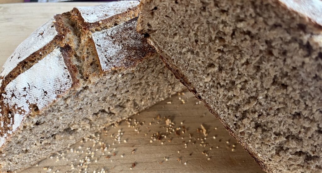 I used my own sourdough starter, which is 50/50 flour and water by weight, and which was refreshed and active. I baked it in my Lodge combo cooker, which is a great way to get a good crust on a boule. Starting in the morning, I fed and expanded my starter in two increments. By early evening I had the right amount of fully active starter for the recipe and I made the dough. It had its first rise of about 3 hours and then I put it in a banneton and in the refrigerator for its second rise overnight. In the morning I preheated the oven and combo cooker and baked it for breakfast around 8:30.