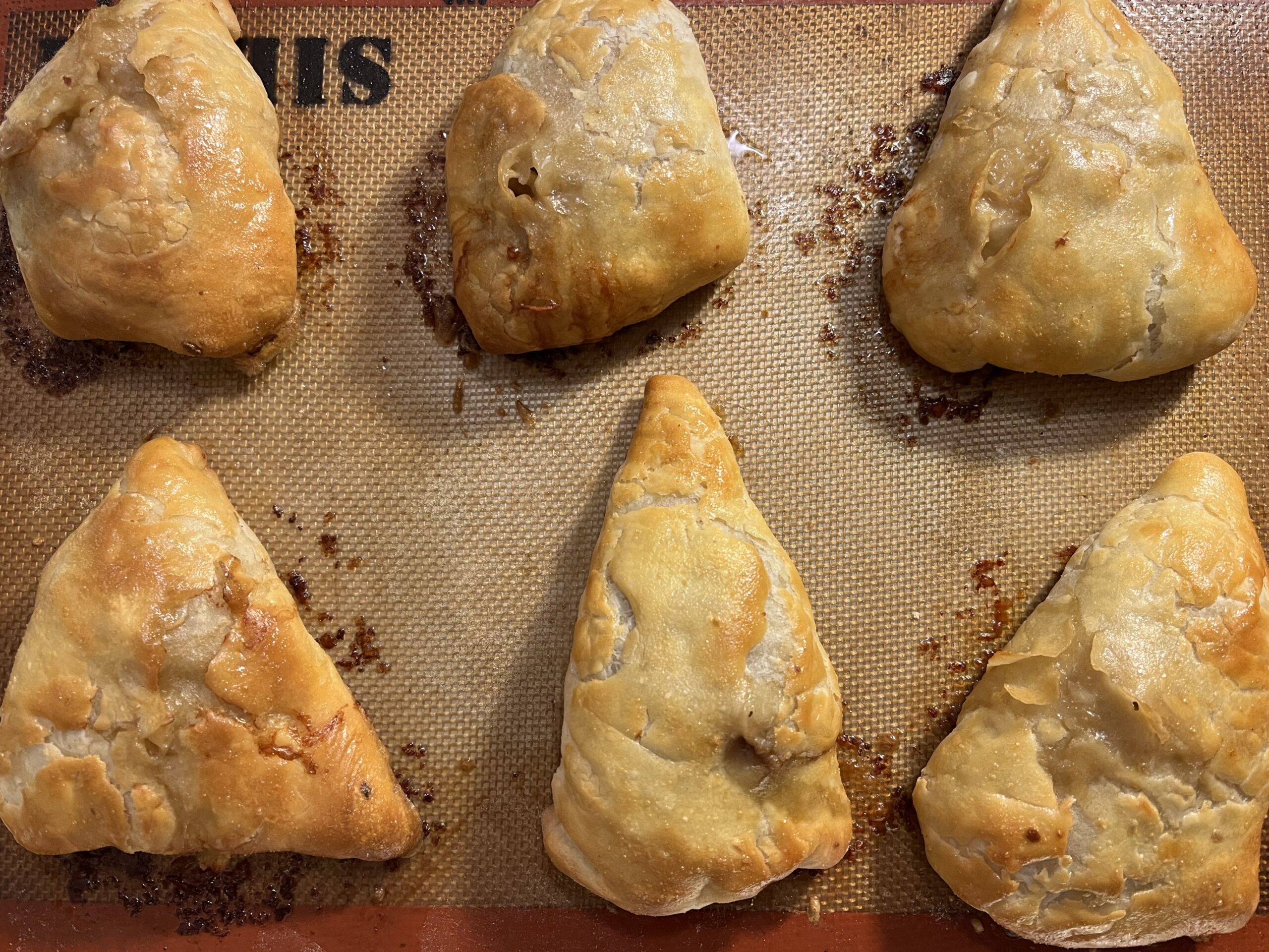 We recently took a trip to Uzbekistan, Kazakhstan and Kyrgyzstan. A common dish on breakfast buffets and appetizer menus was a flaky savory pastry filled with lamb, beef, or pumpkin called samsa or somsa. Here is my first version of making it at home. I adapted a recipe from Food52.com in which the author went through some extra steps (which I skipped) to try to bake the samsas on a slant to mimic how they are frequently made commercially, which is stuck to the walls of a tandoor oven. (I baked them flat on a baking mat in a pan on top of a heated baking steel.
